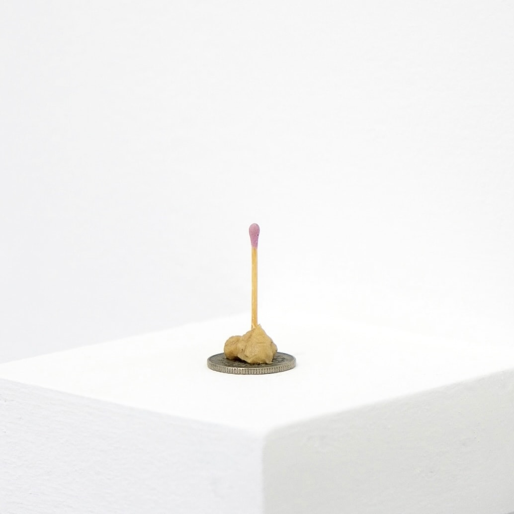 The inspiration behind this exhibition, this artwork by Wilfredo Prieto is constructed with simple items he had on hand which comprises of a coin for the base of the cake, chewing gum for frosting and a matchstick for a candle.