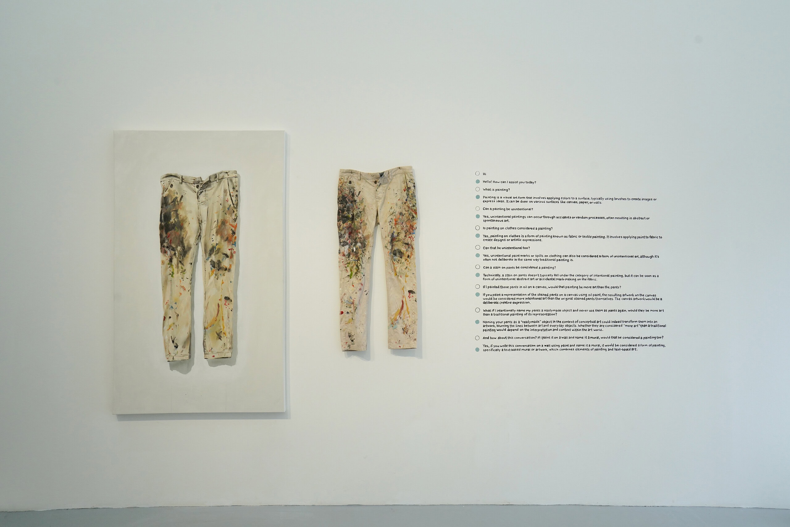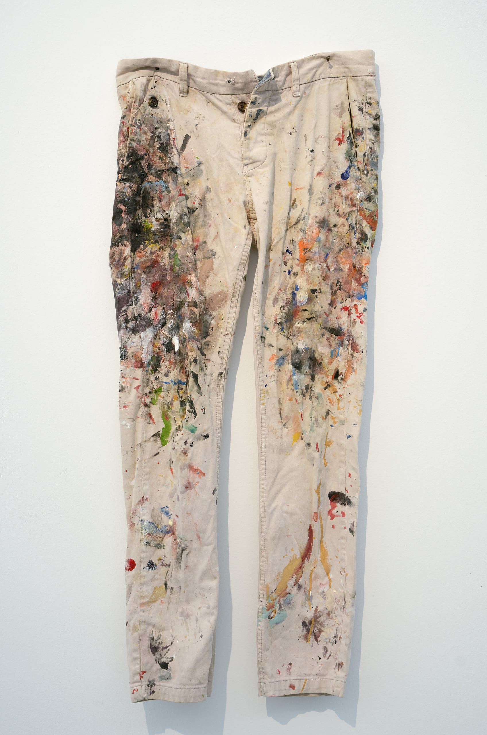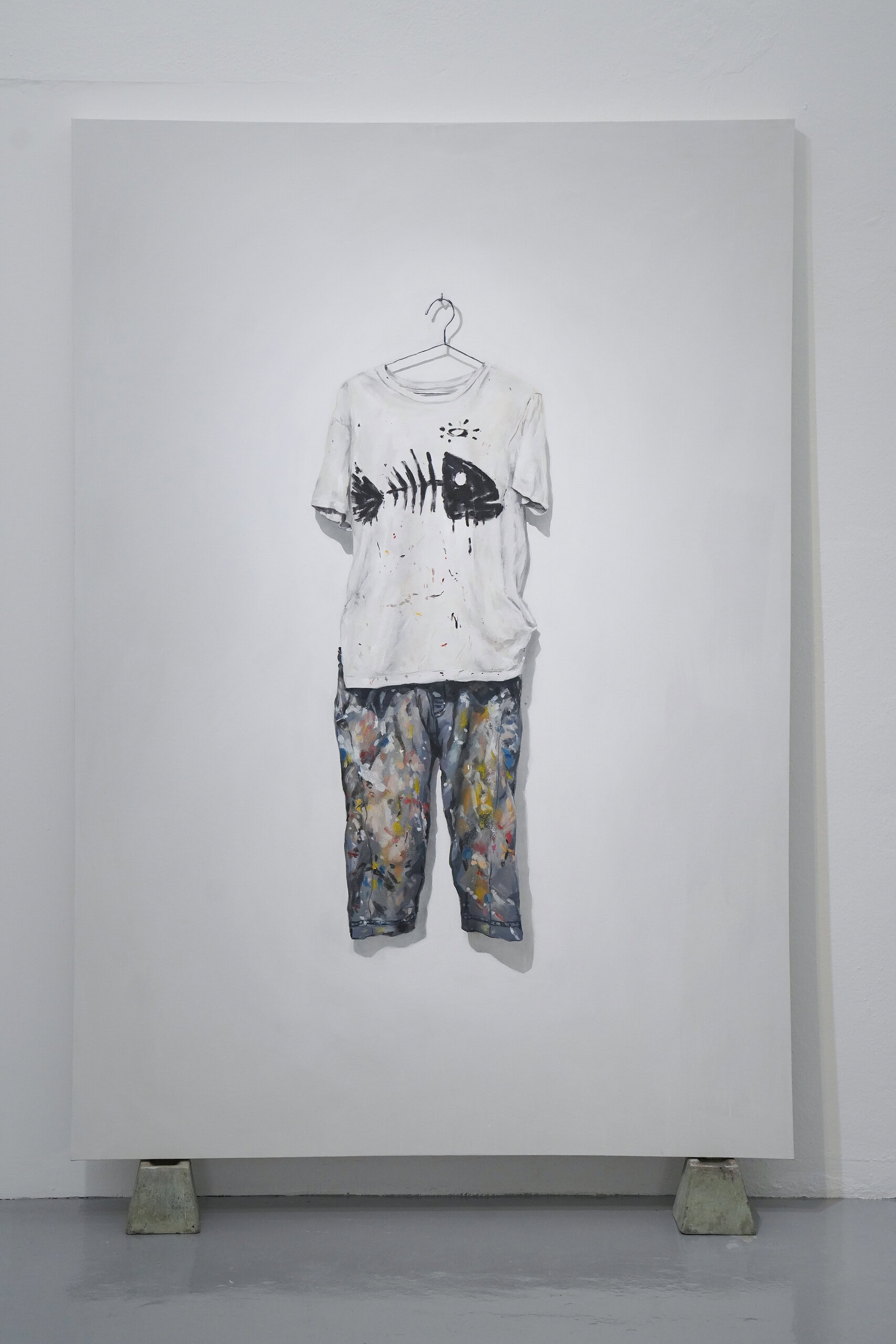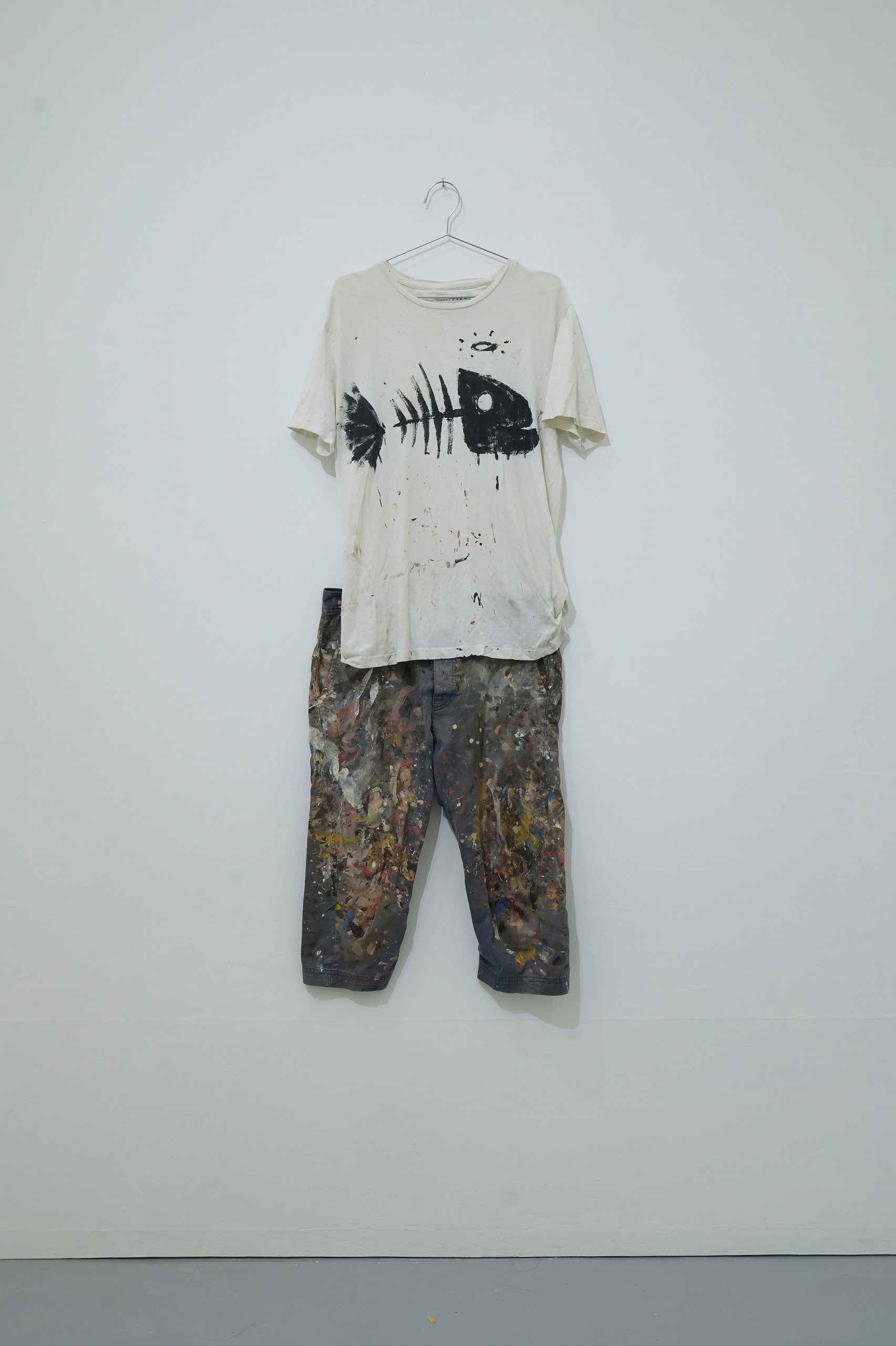 This is a painting of a painting of a fish painted by the artist Bibi Chun on an outfit that the artist has worn while painting other paintings. With the outfit displayed mirroring the painting this work highlights the contrast between intentional and unintentional mark making.
