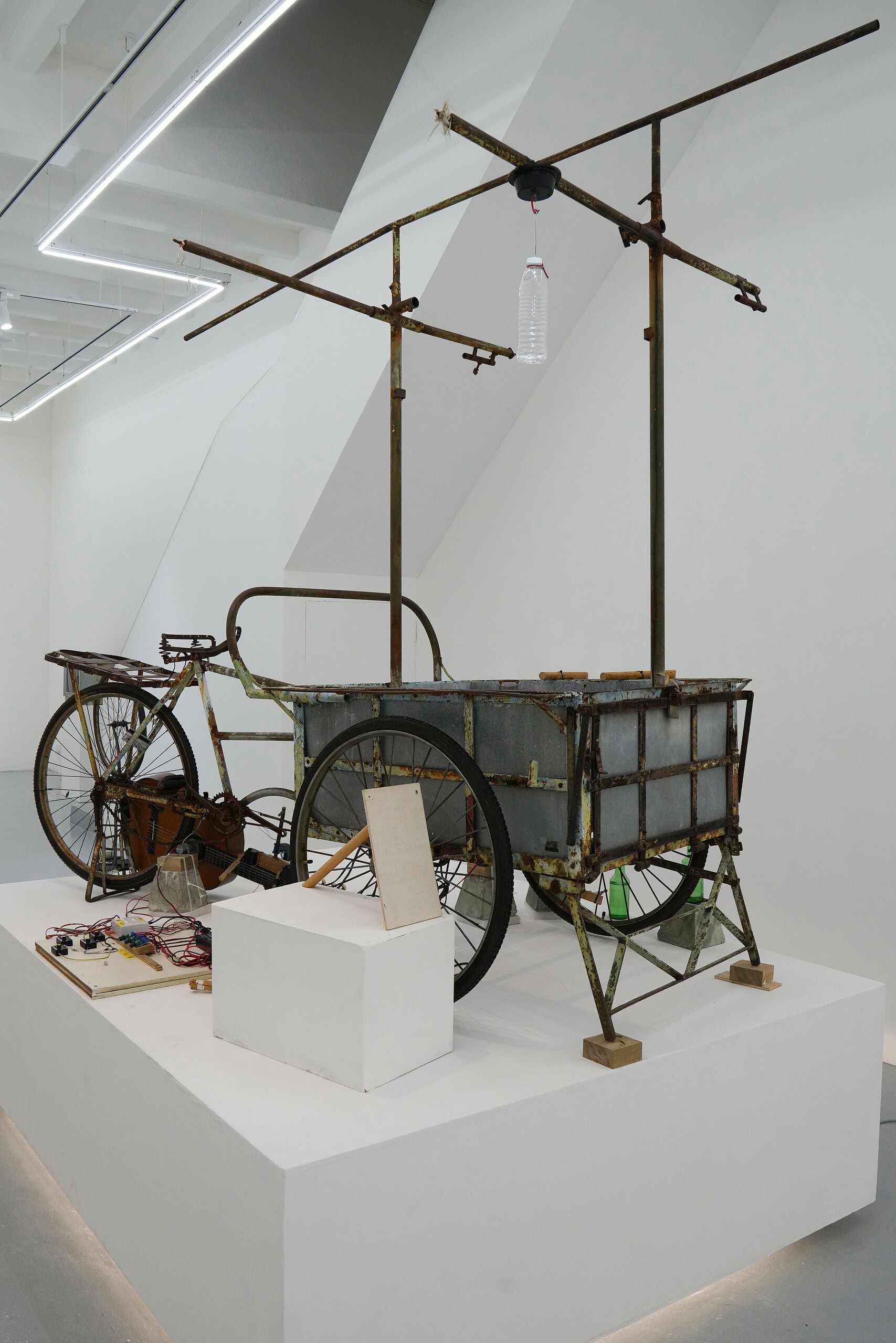 Neither a sculpture nor a musical instrument, this work is an experience which engages viewers to play around the installation and to observe its component objects and the sounds they create. The immediately recognisable form of the rickshaw falls in sharp contrast to the chaotic setup of the entire work, further emphasising the feeling of nostalgia for the familiar.