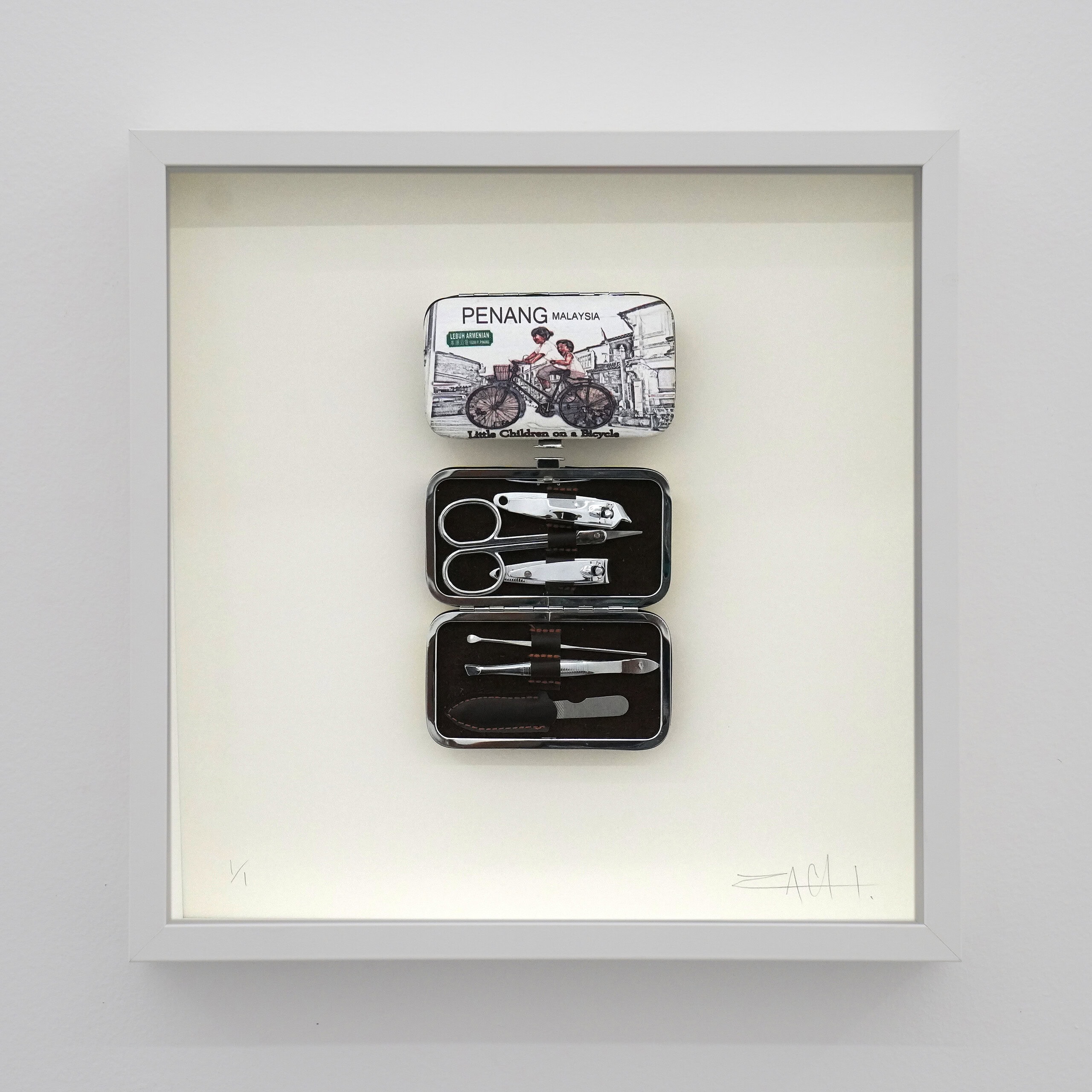 The artist’s most known work, painted on a Georgetown wall more than a decade ago, has been appropriated in a countless number of ways. From fridge magnets and keychains to live-scale mural replicas and even to clothing items, the painting of children on a bicycle can be found in souvenir shops and restaurants in Penang, the rest of Malaysia and, indeed, all around the world. While the original mural has nearly entirely faded through time, the image of the painting has nevertheless developed a life of its own. It lives on in infinite iterations. In an attempt to document these myriad forms of the capitalist appropriation of his mural, the artist has set out on an adventure to collect 9,999 different items containing his work. The collection comes accompanied by the video of the artist purchasing the objects in the various shops around Penang.