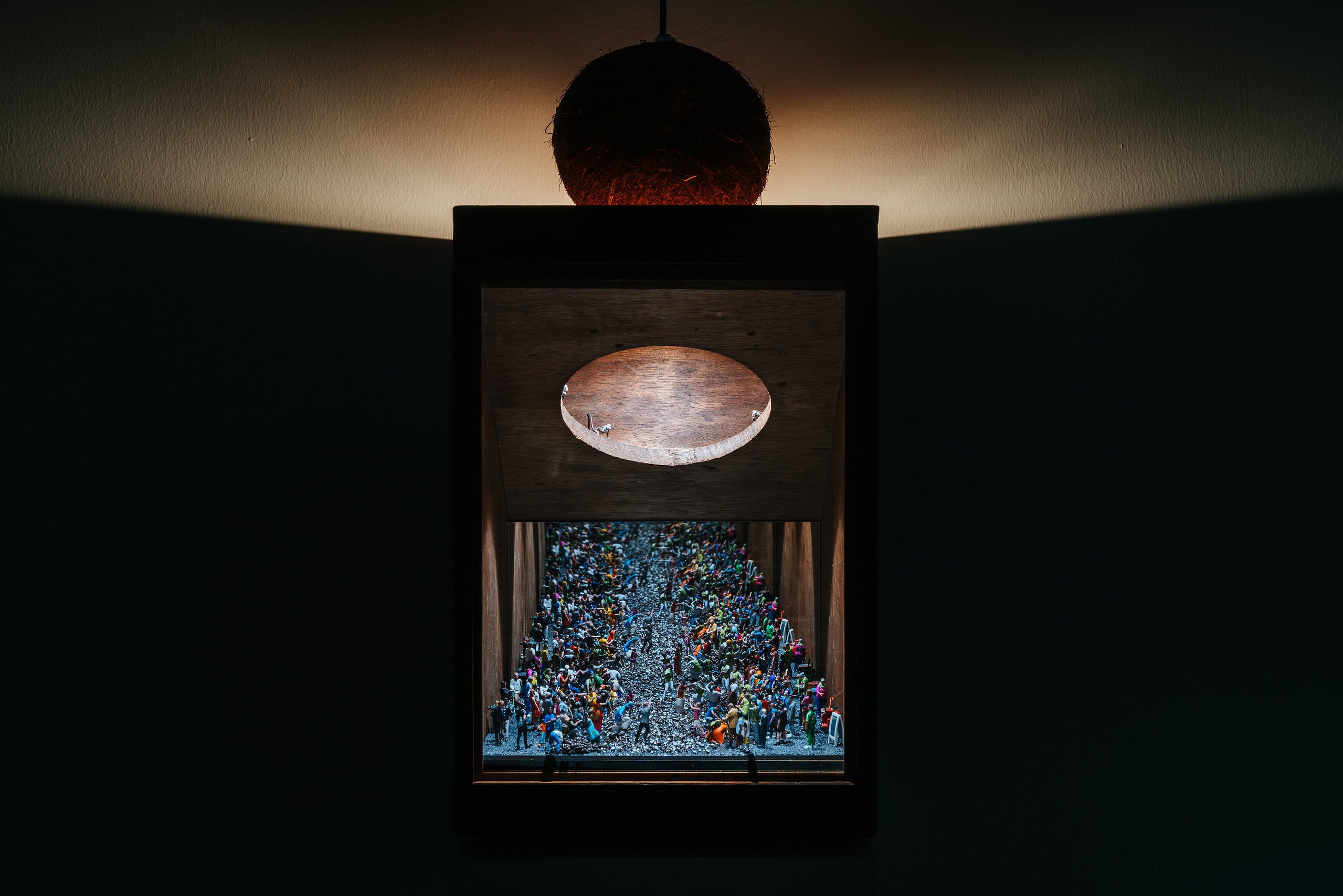 In the series In Endlessness and Wandering, the artist creates mirrored, boundless perspectives within miniature sculptures, guiding viewers to circumnavigate the works and explore fantastical worlds enclosed within boxes. Through these delightfully intricate three-dimensional story boxes, the meticulous craftsmanship encourages audiences to patiently spend time uncovering clues within each piece. Peering through narrow windows creates a cinematic effect, immersing viewers within fantastical realms. Stepping back reveals intricate details encircling the works from all sides. WindowScape series, meanwhile, functions as a side portrait, infusing the amusement park with a rhythm of observation, contemplation and pause, inviting the audience to take a moment’s respite from the visual spectacle.