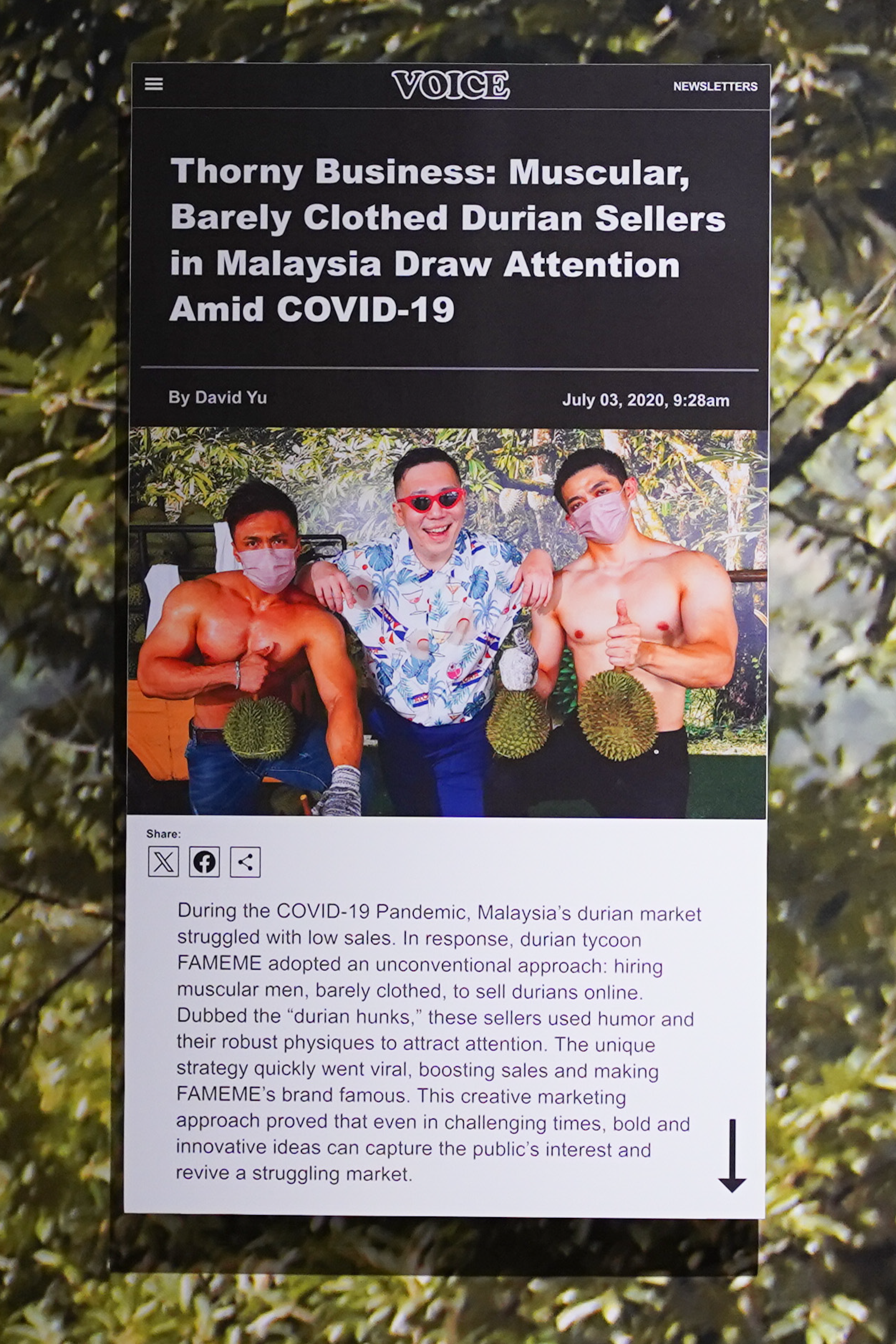 The global closures caused by the COVID-19 pandemic hit all industries hard. In order to keep his family’s durian business afloat, FAMEME came up with the creative strategy of hiring attractive, hunky men to promote his merchandise. This novel tactic made social media headlines, resulting in a news article on The Voice in July 2020.