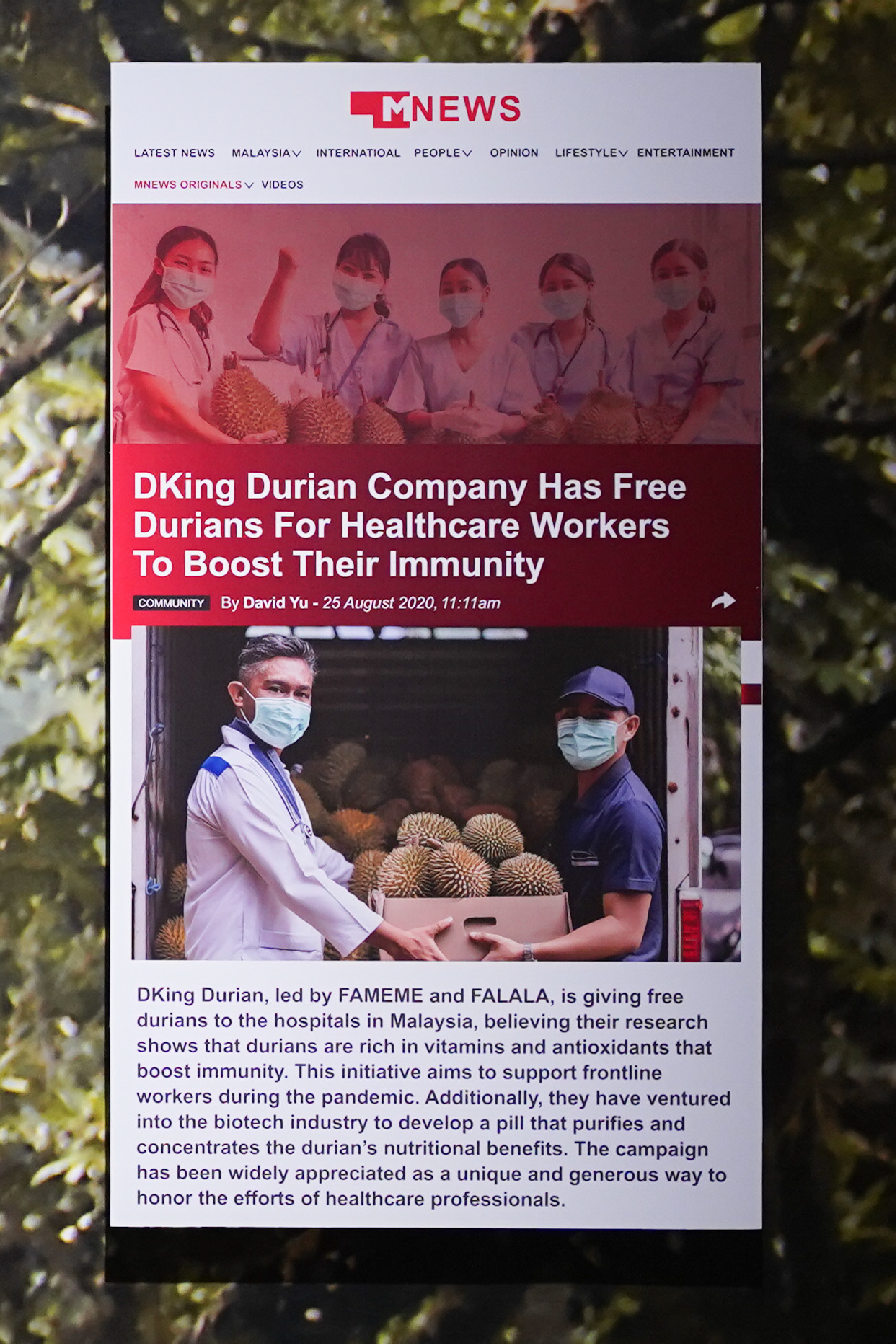 One of the issues faced by FAMEME’s family durian business was the stockpiles of the fruit that could not be sold, simply sitting in their warehouses. He and his sister, FALALA, decided to donate durians to local hospitals. It was at this time that FAMEME began to consider the possibility of distilling nutrients from durians, as a means of retaining their essence. This article appeared in M News.