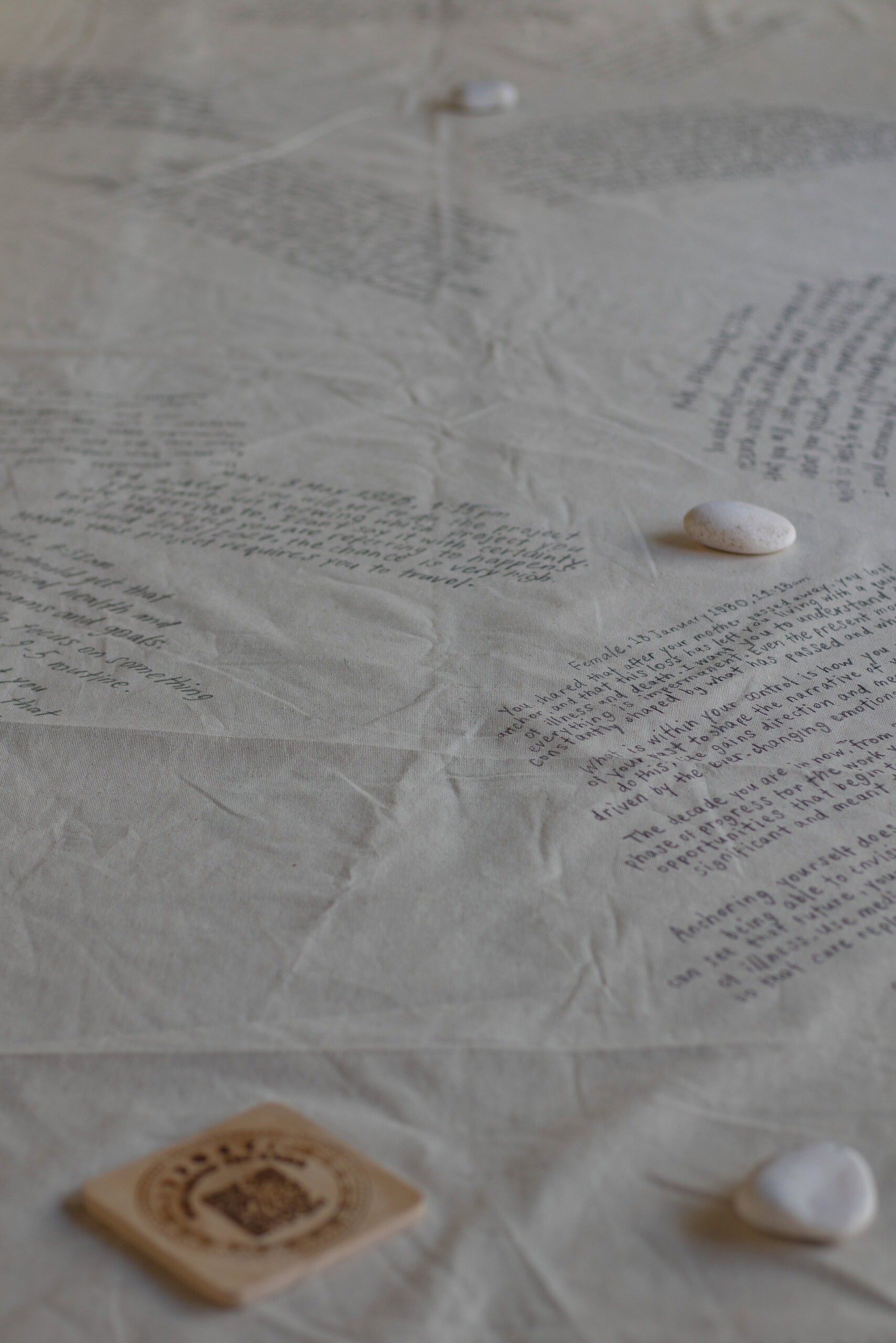 The Table of Inquiry is a space for intimate encounters, shared reflection, and ongoing dialogue. This extension of Reading by an Artist expands the focus from the individual to the collective. The performance begins with a large blank canvas weighted by nine stones. The canvas and stones form a ritual surface that draws care and attention. Over the residency period, the artist writes responses to single questions submitted by participants, gradually covering the entire surface with texts.
